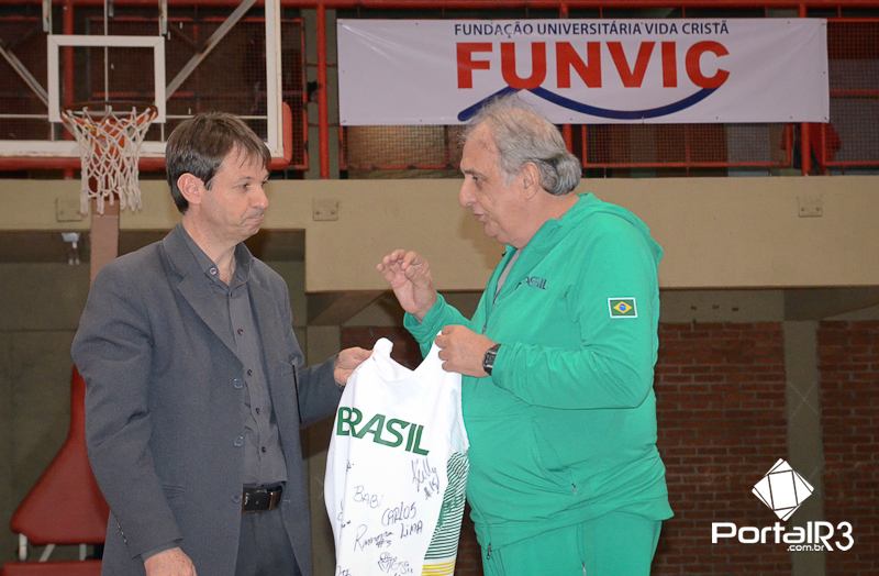 Luis Otávio recebeu uma camiseta da Seleção Brasileira das mãos do coordenador técnico do Brasil, Carlos Barbosa. (Foto: Luis Claudio Antunes/PortalR3)