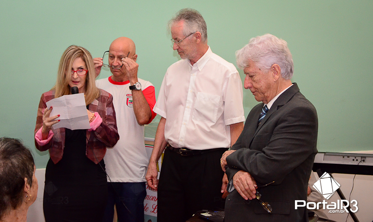 Ao centro, Bete e Edmar, presidente e vice, que continuarão à frente da APL por mais dois anos, durante o tradiconal Parabéns a Você. (Foto: Luis Claudio Antunes/PortalR3)