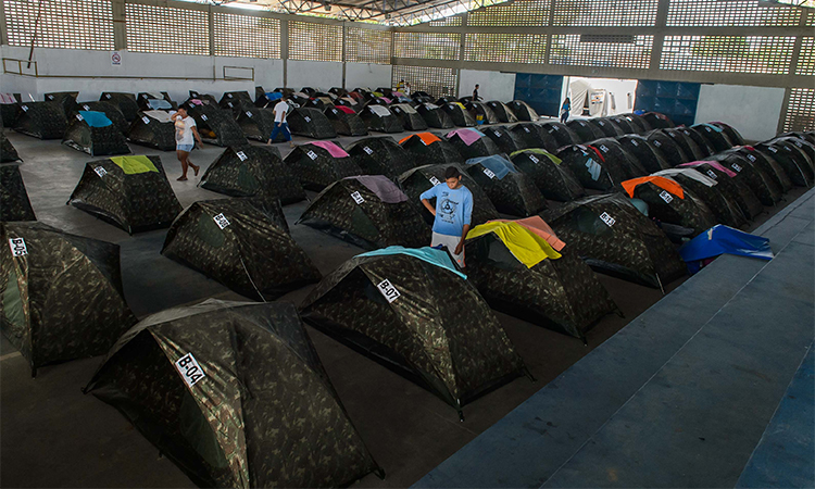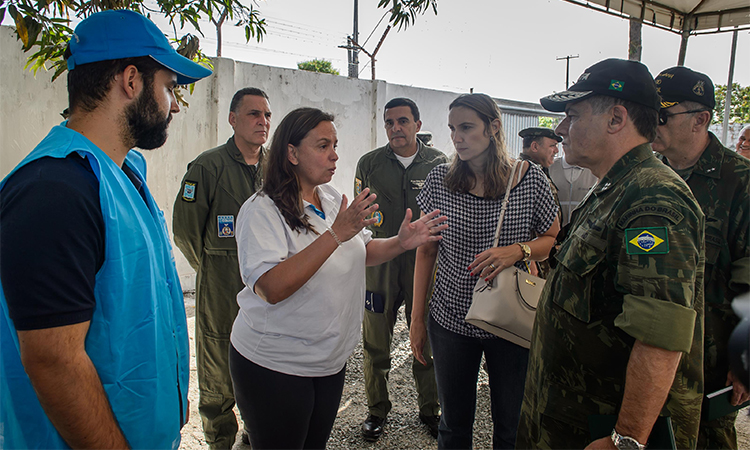 Ela também falou sobre as mudanças ocorridas no abrigo Tancredo Neves: “nós temos nossos arquitetos que fazem o layout e o pessoal do Exército, do Ministério da Defesa, vem com seus engenheiros, suas máquinas e, em 36 horas, hoje, é outro lugar. Eu estive, em um ano, tentando avançar nessa infraestrutura e quando os militares chegaram, nos juntamos, e este é o resultado”. O abrigo tem barracas com colchões, contêineres de banheiros e área de alimentação.