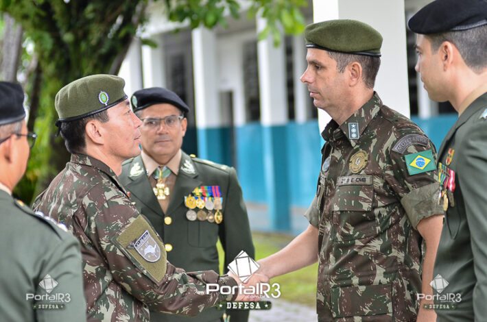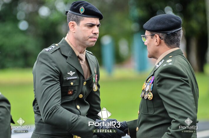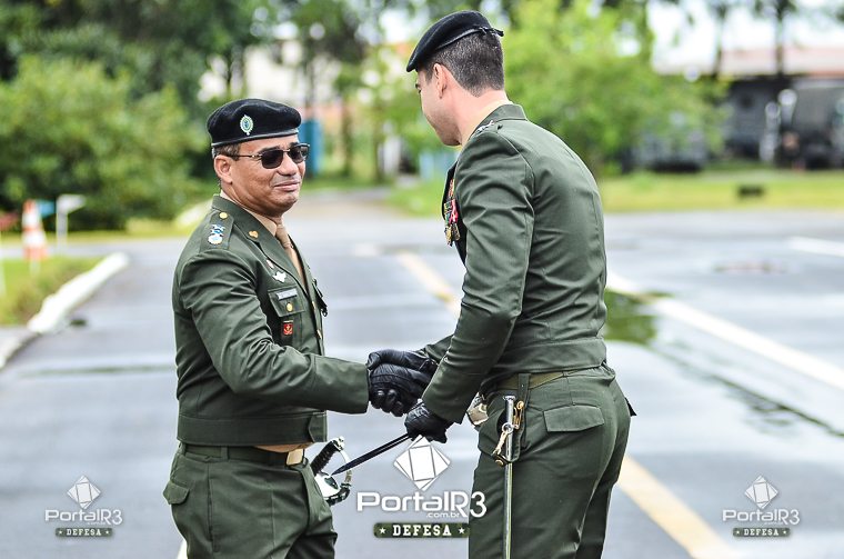 Novo comandante cumprimenta o comandante da 11ª Brigada de Infantaria Mecanizada. [Foto: Allan Modesto | PortalR3]A sequência se deu com leitura do currículo do novo comandante e ato de transmissão e assuncão ao cargo, com continência à bandeira e apresentação do novo e antigo comandante ao general Oliveira. Logo após, o novo comandante passou em revista à tropa. O capitão Souto Monteiro, que chega ao comando em Pindamonhangaba vindo de um período de curso na Alemanha, falou sobre esta nova fase em sua carreira.