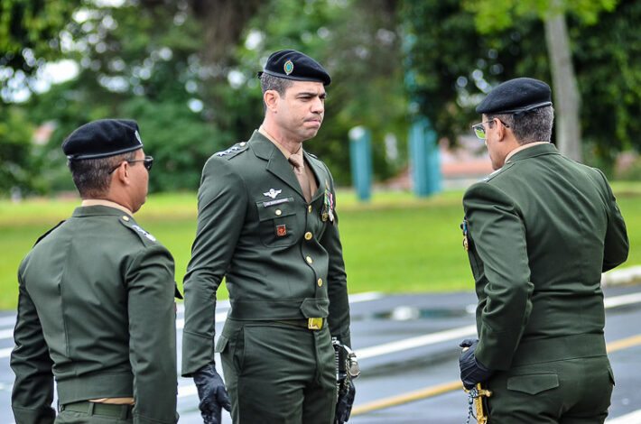 A cerimônia militar no pátio de formaturas começou com apresentação da tropa, canto do Hino Nacional, seguido das palavras de despedida do major Thiago Cardoso e leitura pelo comandante da 11ª Brigada da referência elogiosa concedida ao ex-comandante da Companhia Barão de Pindamonhangaba.