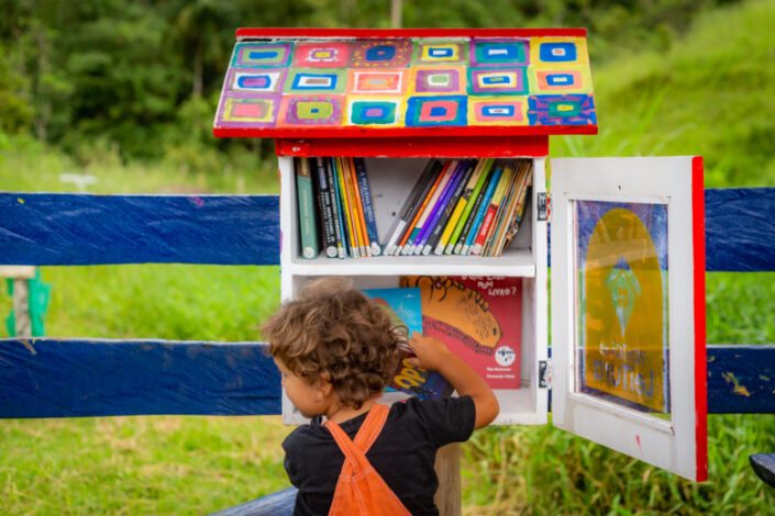 Cada mini biblioteca, construída com madeiras recicladas e pintadas por crianças do próprio bairro, oferece um acervo de 30 livros, nos mais diversos gêneros. Os livros podem ser emprestados e devolvidos no mesmo local ou em outros pontos do distrito.