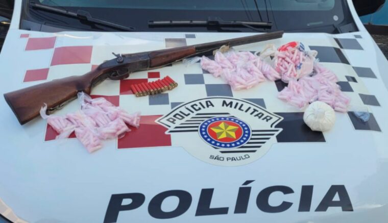 Apesar da tentativa de fuga, os policiais saíram no encalço do criminoso e conseguiram abordá-lo quando adentrava em uma residência. Ele trazia consigo porções de cocaína já prontas para a venda, e, após ser indicado que no local haviam outros ilícitos, na diligência foram encontrados mais drogas, sendo cocaína a granel e cerca de 430 porções do mesmo entorpecente, bem como, foi localizada uma espingarda calibre .36, cuja numeração estava suprimida, além de 12 munições.