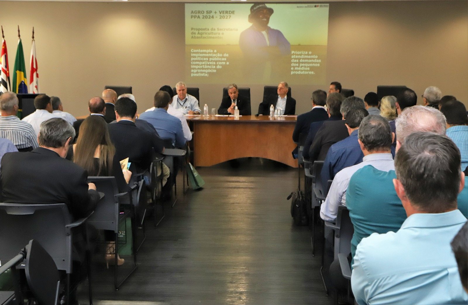 O secretário de Agricultura e Abastecimento, Antonio Junqueira, apresentou a 36 prefeitos e representantes de 46 municípios o Programa Agro Paulista + Verde, que define as diretrizes e objetivos estratégicos do Governo de São Paulo e contempla os programas governamentais, com recursos, indicadores e metas para cada área de atuação.
