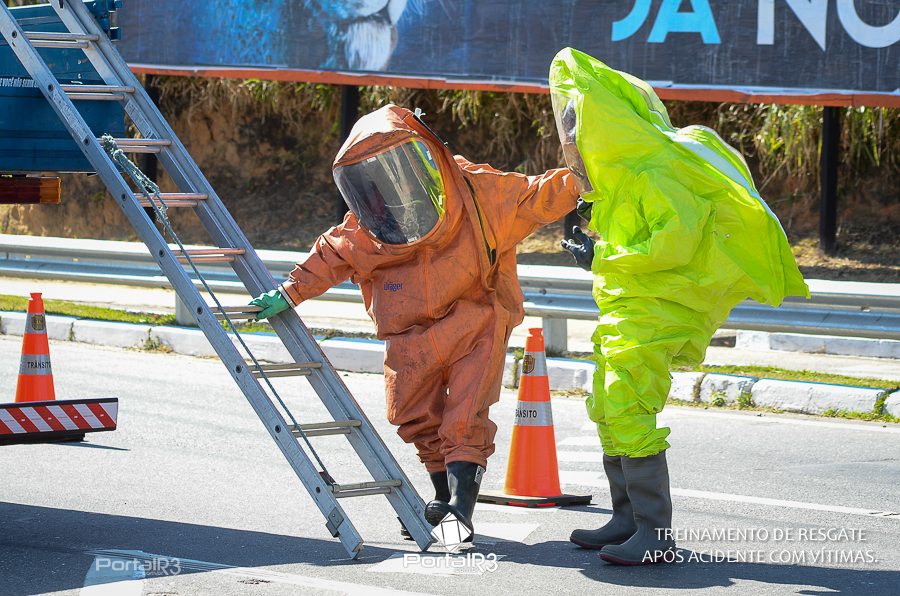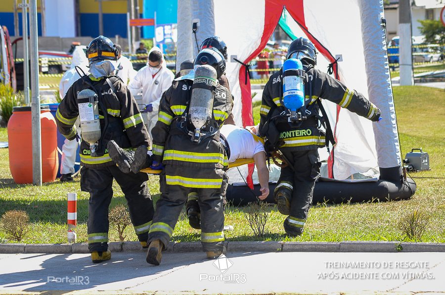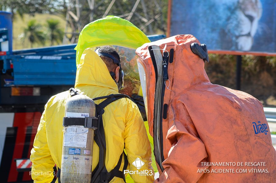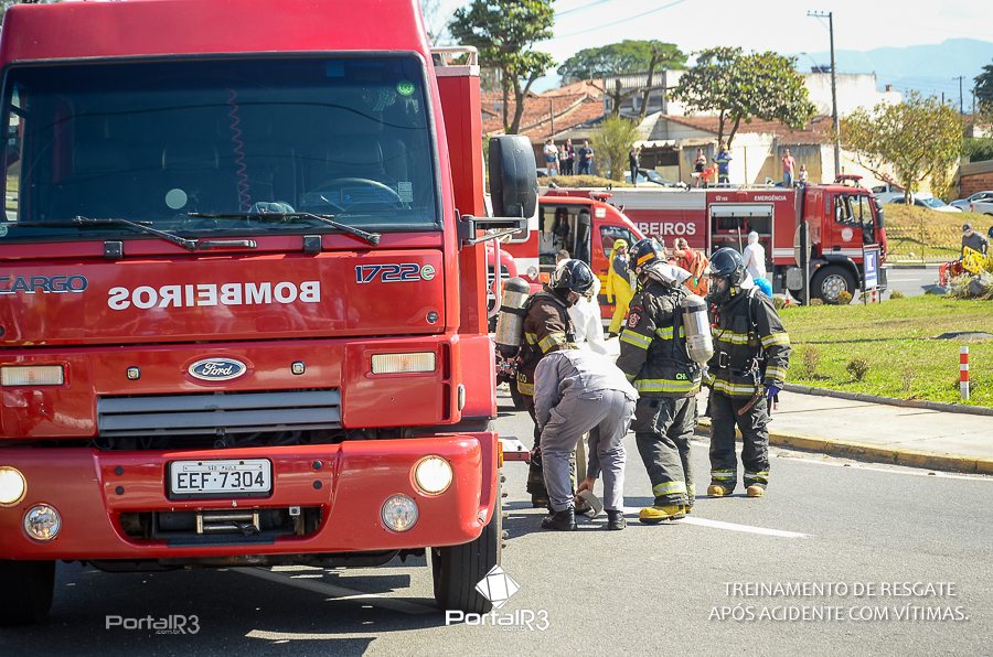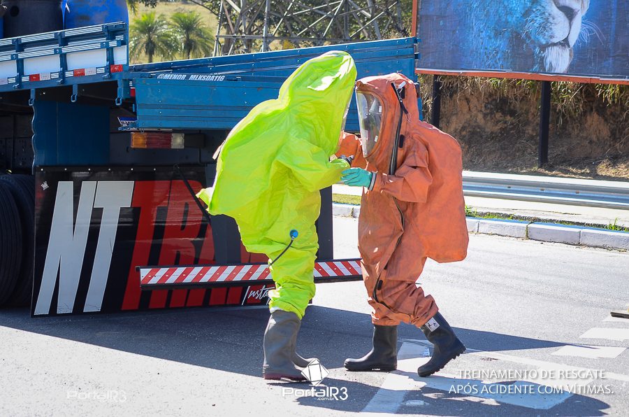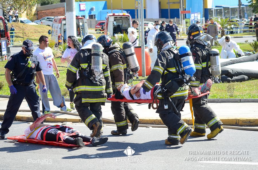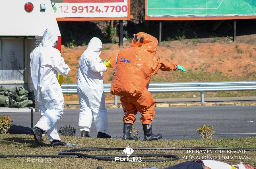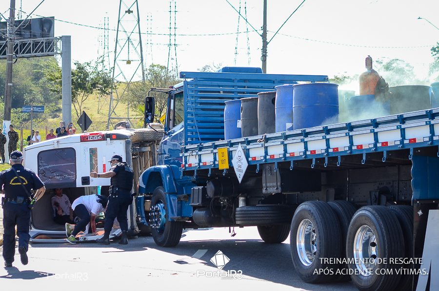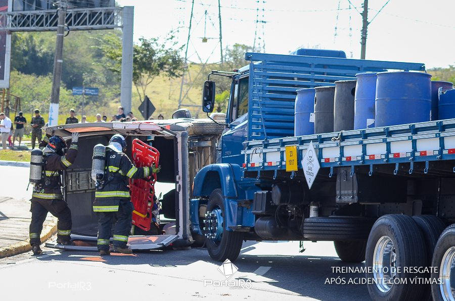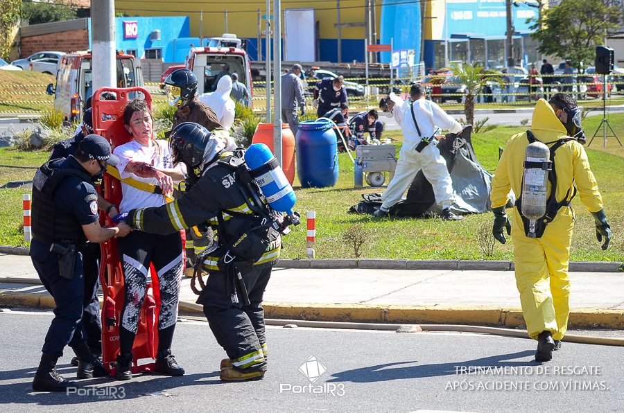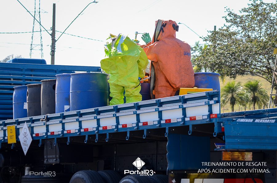 Simulado de resgate após acidente de trânsito com vítimas e vazamento de produtos químicos. (Foto: Alex Santos/PortalR3)