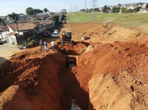 No local conhecido como “linhão” foram instalados tubos de concreto de 80 centímetros em um trecho de cerca de 200 metros. A obra tem como objetivo captar a água da chuva e direcioná-la para o piscinão localizado no bairro.