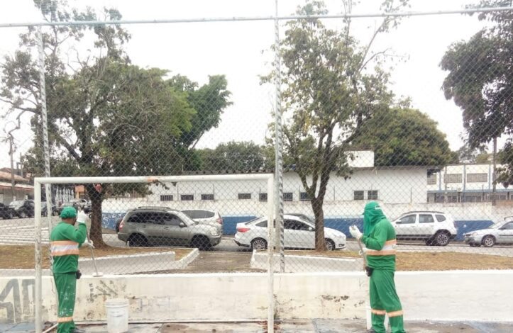 Na Vila Jabuticabeiras, as equipes realizaram a revitalização da pintura do meio fio e áreas da quadra de esportes, ao lado da escola municipal do trabalho.