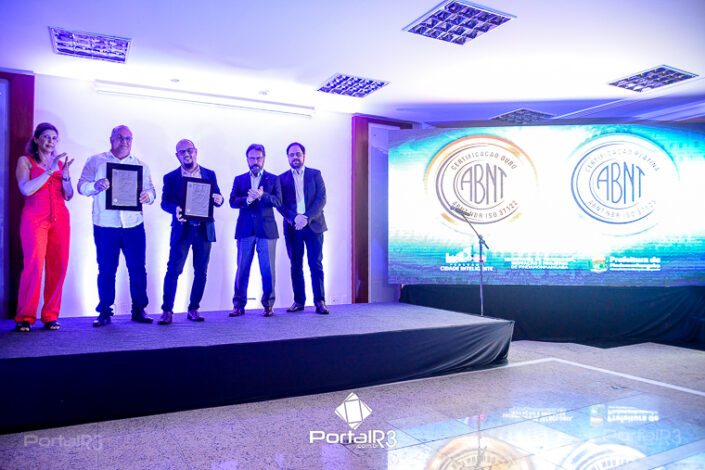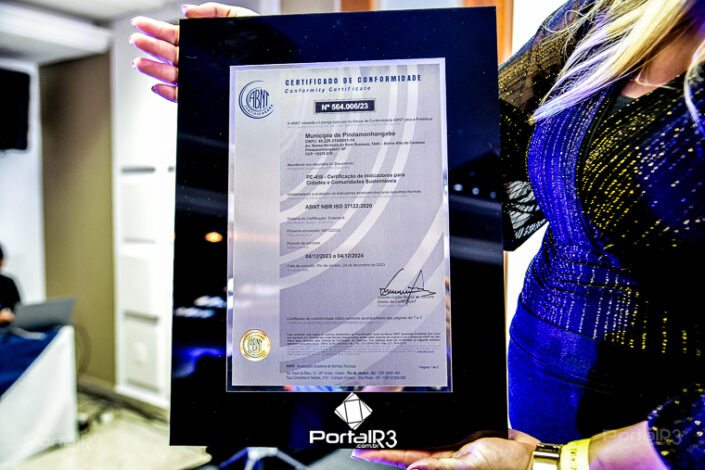 Pindamonhangaba recebe certificados da Associação Brasileira de Normas Técnicas – ABNT. [Foto: Allan Modesto | PortalR3][/caption]Em um evento realizado na noite da segunda-feira, dia 4 de dezembro, a cidade de Pindamonhangaba recebeu da Associação Brasileira de Normas Técnicas – ABNT duas certificações que atestam a conformidade de seus indicadores para Cidades Inteligentes e Resilientes, de acordo com as normas ABNT NBR ISO 37122 e ABNT NBR ISO 3710.