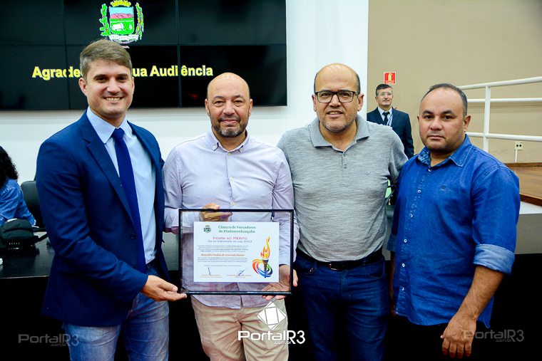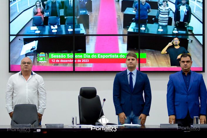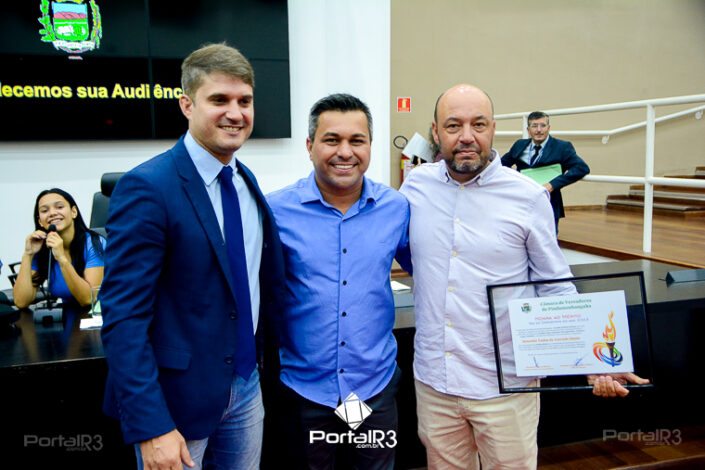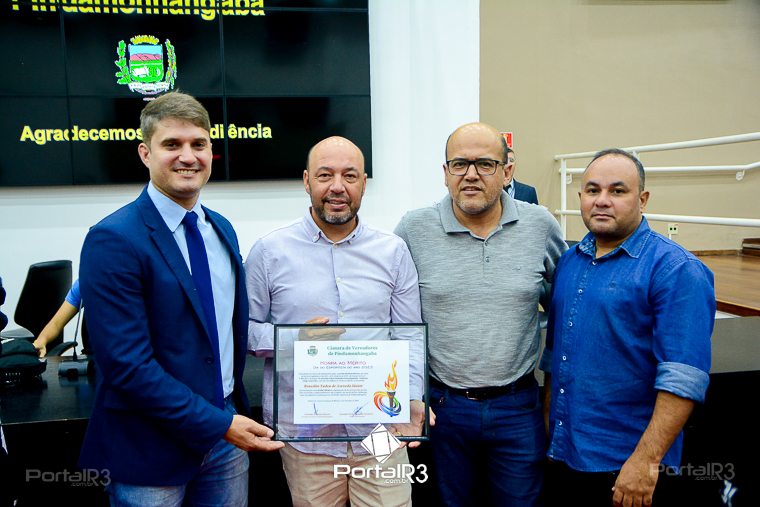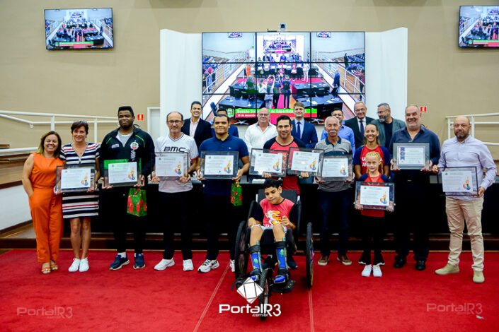 Homenageados da noite. [Foto: Allan Modesto | PortalR3]Na noite da terça-feira (12), uma sessão solene na Câmara de Vereadores de Pindamonhangaba celebrou o “Dia do Esportista do Ano”. A sessão solene foi instituída por intermédio do Decreto Legislativo nº 06/2022 e organizada por meio do Requerimento nº 4.878/2023, de autoria do vereador Professor Felipe Guimarães.