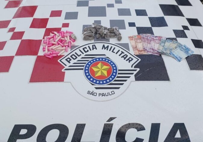 Na abordagem, foi localizada a sacola que continha 40 porções de maconha, 64 pinos de cocaína e R$ 55 em dinheiro.