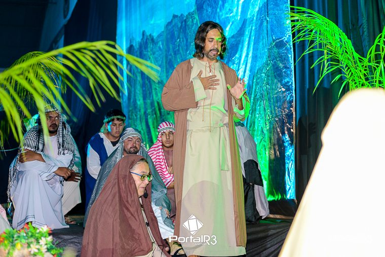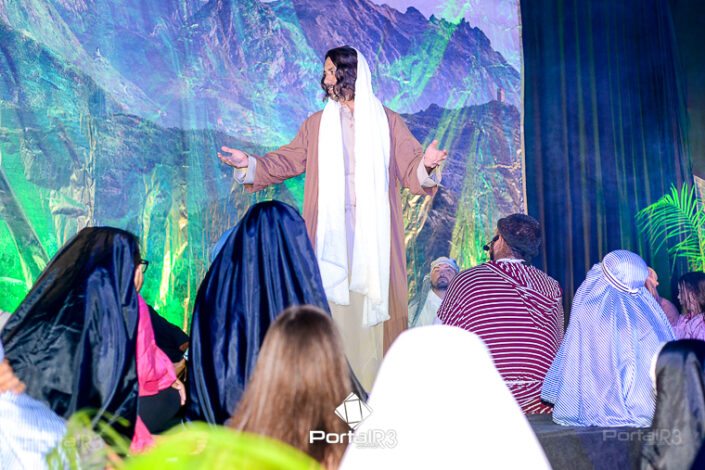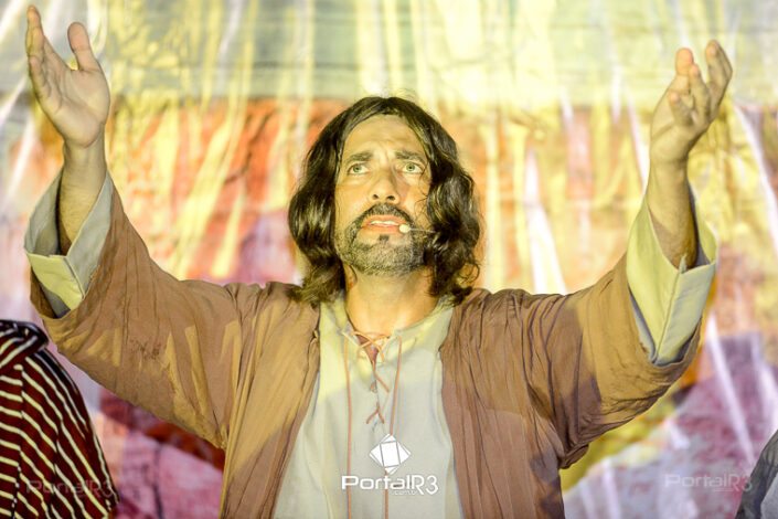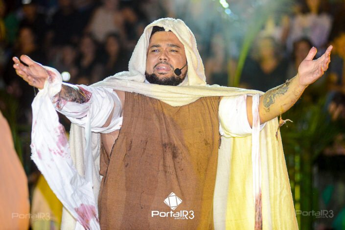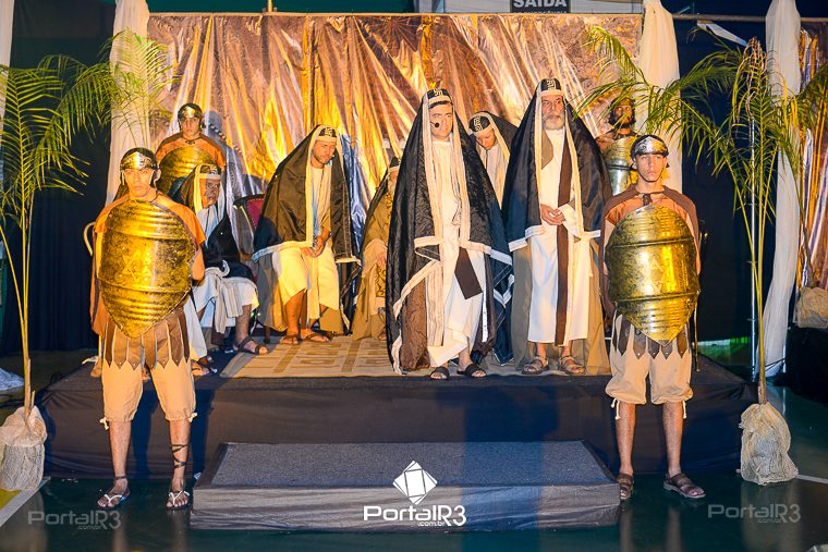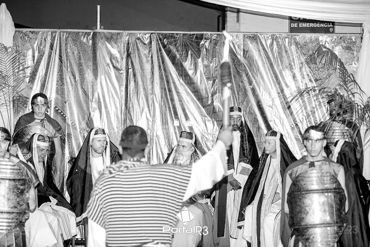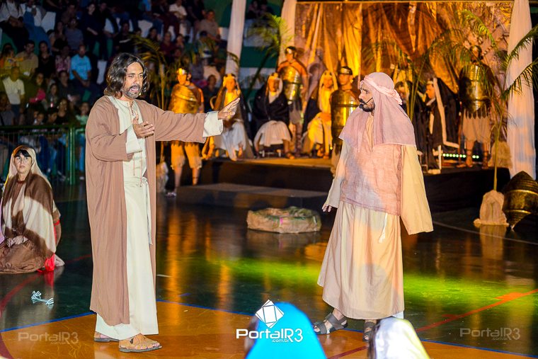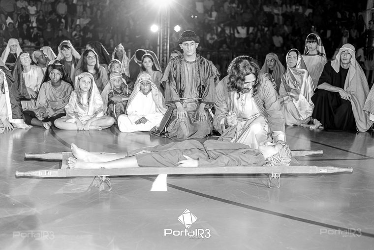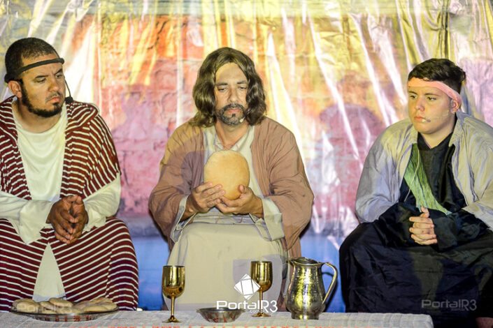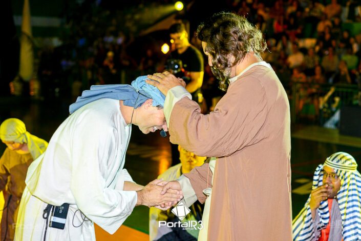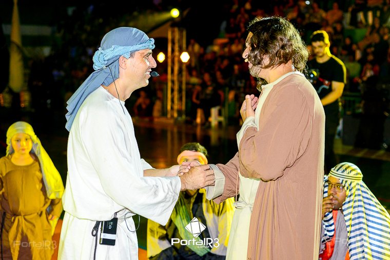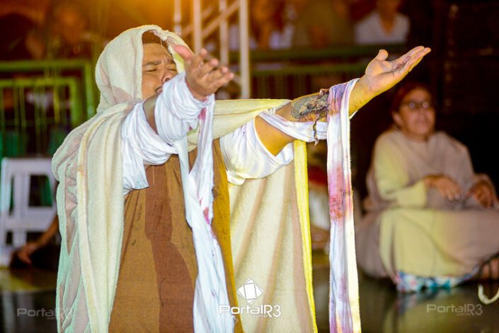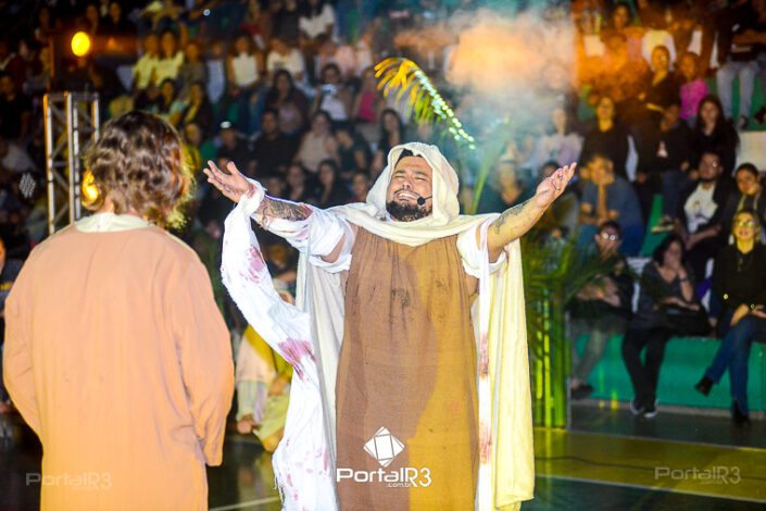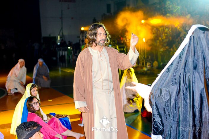 Encenação “Paixão de Cristo” na Ferroviária em Pindamonhangaba. [Foto: Allan Modesto | PortalR3]Na sexta-feira, 29 de março, mesmo em uma noite chuvosa em Pindamonhangaba, o ginásio da Associação Atlética Ferroviária ficou lotado para prestigiar a encenação da Paixão de Cristo, que também celebrou os 30 anos sob organização da Comunidade Aliança Jesus Agora (CAJA).