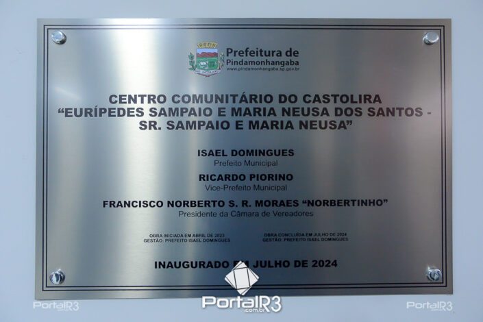 Inauguração do Centro Comunitário do Castolira em Pindamonhangaba. [Foto: Allan Modesto | PortalR3]Ontem (23), foi inaugurado o Centro Comunitário do bairro Castolira, na rua Syllas Brandão, ao lado da quadra coberta, em Pindamonhangaba. O espaço, construído por uma empresa especializada, possui um salão principal, palco, salas de apoio, copa, vestiários e sanitários inclusivos, totalizando 539,12 m² de área construída. O valor total do contrato foi de R$ 1.558.798,72. O Centro Comunitário foi nomeado em homenagem ao casal Eurípedes Sampaio e Maria Neusa dos Santos.
