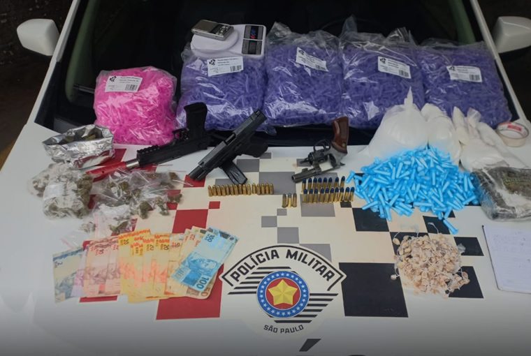 No local, os policiais apreenderam uma vasta quantidade de materiais ilícitos, incluindo 01 pistola calibre 9mm, 01 revólver calibre 38, 324 pinos de cocaína, 238 pedras de crack, 30 porções de maconha, além de apetrechos utilizados para o embalo e produção de drogas. Também foram encontrados R$ 660,00 em dinheiro e um caderno com anotações relacionadas ao tráfico.