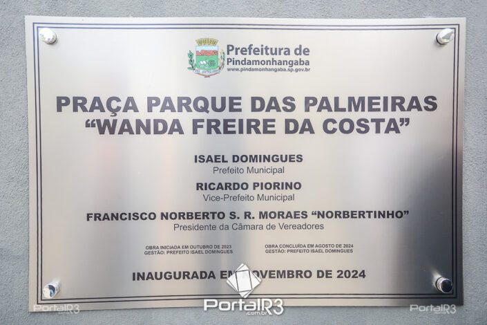 A Prefeitura de Pindamonhangaba inaugrou, na terça-feira (12), a Praça do Parque das Palmeiras, denominada Wanda Freire da Costa. O espaço, que ocupa uma área de 20 mil m² ao lado da Rodovia Vereador Abel Fabrício Dias, conta com pista de caminhada acessível, iluminação em LED, novos elementos paisagísticos, playground, Estação Vida Saudável e agora passa a contar com área de lazer, como bancos de alvenaria, áreas de jardim e uma pista de caminhada de 1,2km.