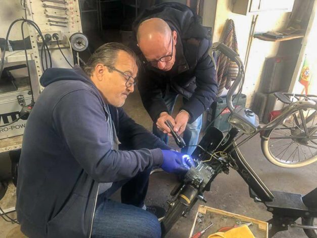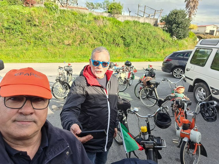 Nesta nossa aventura tivemos sorte, pois partimos com clima agradável e as previsões até apontavam para um agravamento tempo, o que em parte se veio a verificar, mas pelo menos não choveu. As VeloSolex (ou Solex) são bicicletas com motor auxiliar a combustão – agora só se fabricam elétricas -, pelo que os pedais apenas estão lá para uma ou outra subida mais íngreme. E até foram necessários, principalmente na segunda etapa da viagem, pois desde a fronteiriça cidade de Valença, em Portugal, até Porrinho, concelho da província de Pontevedra, na Galiza, Espanha, aquilo sobe bem. As mais de três centenas de quilómetros de ligação entre a cidade da Maia e Finisterra lá foram cumpridas com sucesso, ainda que com algumas avarias de permeio, prontamente solucionadas pelo Nuno Cordeiro, o melhor mecânico do mundo e arredores.