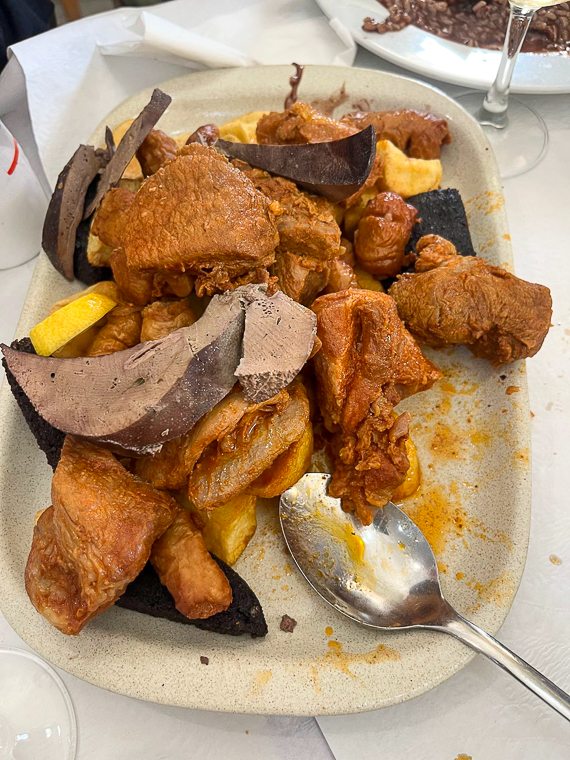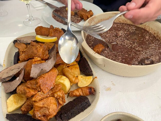 Antes da partida tivemos um dia de testes, com uma subida à Serra da Agrela, no concelho de Santo Tirso, distrito do Porto, e a exigência do trajeto obrigou mesmo a umas boas pedaladas. Tudo em ordem, as Solex responderam bem ao esforço e nós fomos devidamente recompensados com um almoço de excelência numa casa típica da zona. O repasto foi servido na antiga messe dos guardas prisionais da cadeia de Paços de Ferreira – ainda ativa -, espaço esse agora transformado num restaurante de muita qualidade e com iguarias de comer e chorar por mais. Eu fui num pernil assado no forno, mas outros optaram por bochechas de porco estufadas e feijoada à transmontana, um dos pratos mais tradicionais da gastronomia portuguesa, à base de orelha, focinho e chispe de porco fumado, mais o saboroso feijão vermelho e arroz no forno. Esta iguaria é muito apreciada no Domingo Gordo, antes do Carnaval, e reza a história que teve origem na região de Trás-os-Montes. Nada que os nossos amigos brasileiros desconhecem, pois este é um gosto comum na culinária dos dois países. Pelo que se vê, pratos bem calóricos para o tempo frio, regados à maneira com um verde tinto da região servido em malgas, ou tigelas, de porcelana.