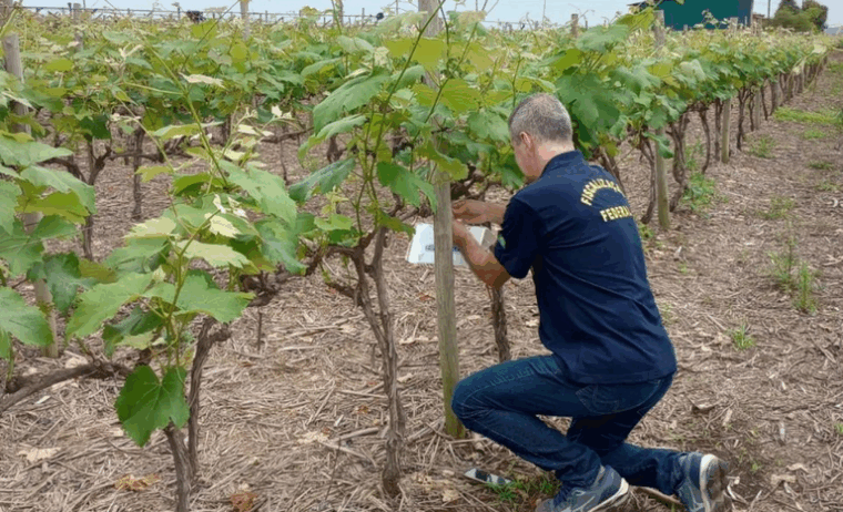 A cada 15 dias, auditores fiscais do Ministério da Agricultura e Pecuária (Mapa) em São Paulo se dirigem a 15 endereços diferentes, estrategicamente escolhidos, para inspecionar armadilhas que monitoram a detecção da traça europeia dos cachos da videira, Lobesia botrana, uma praga quarentenária ausente no Brasil.
