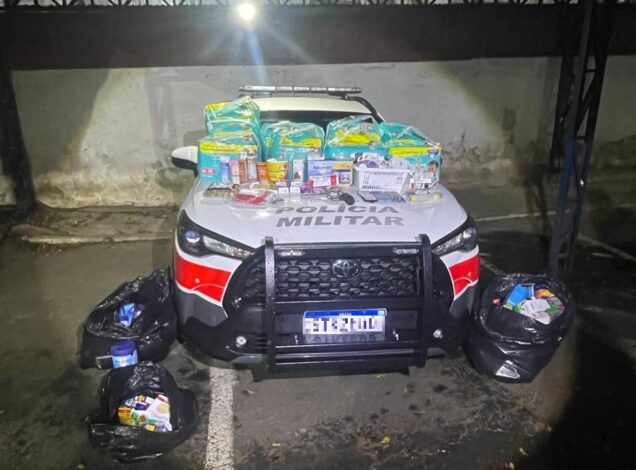 No interior do carro, que estava com as placas trocadas, foram encontrados diversos produtos subtraídos da farmácia.