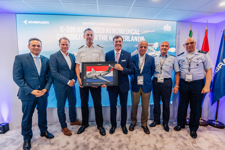 A Embraer e a Holanda assinaram um contrato histórico para fornecer um Sistema de Evacuação Aeromédica de ponta para a frota de aeronaves C-390 Millennium da Força Aérea Real Holandesa. O contrato, que inclui uma encomenda firme e sete opções de compra, foi assinado hoje pelo Vice-Almirante Jan Willem Hartman (MSc), Comandante do Comando de Material e TI, e Bosco da Costa Junior, Presidente & CEO da Embraer Defesa & Segurança, durante uma cerimônia no Paris Air Show.