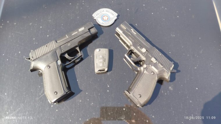 A Polícia Militar prendeu dois homens, de 29 e 32 anos, nesta quarta-feira (18), em Rio Claro, no interior de São Paulo. A dupla estava em saída temporária e circulava na região com um veículo com placas adulteradas e dois simulacros de arma de fogo.