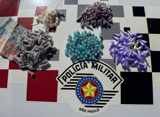Durante patrulhamento, a equipe abordou o criminoso e localizou com ele e nas proximidades R$ 20,00 em espécie, 128 pinos de cocaína, 90 porções de crack e 78 pinos de maconha.