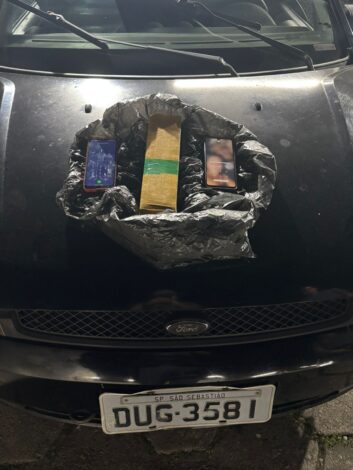 A equipe realizava patrulhamento com foco no combate ao tráfico de drogas no bairro Canto do Mar, em São Sebastião, quando se deparou com o veículo Ford/Fiesta preto, ocupado por um casal.