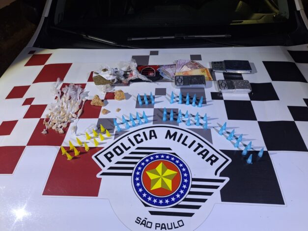 Durante operação para coibir o tráfico de entorpecentes na região conhecida como “Murão”, as equipes realizaram progressão tática em área de mata e surpreenderam o criminoso em posse de uma sacola contendo 52 pedras de crack, 60 pinos de cocaína, meio tijolo de maconha, 4 pedras maiores de crack, 3 buchas de maconha, 3 balanças de precisão e R$ 146,00 em espécie.