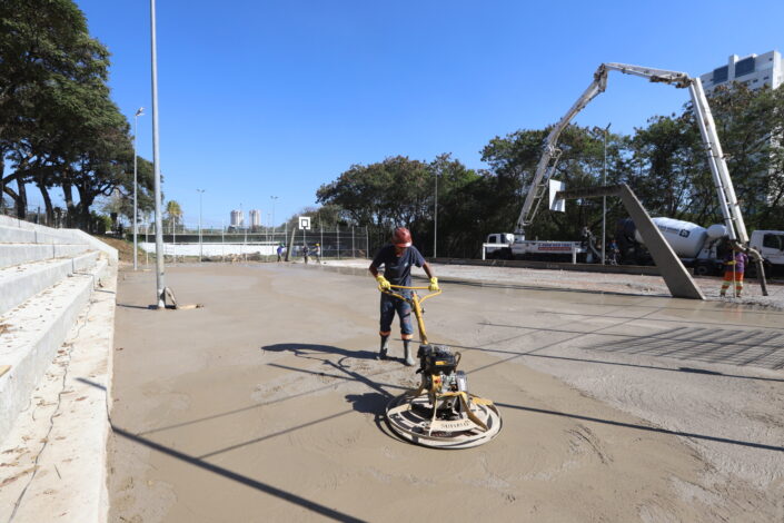 Neste momento, as obras entraram na fase de concretagem da quadra. A arquibancada e o piso da quadra antiga serão substituídos por um novo, mais resistente e adequado para a prática esportiva.