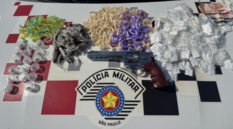 Em vistoria no apartamento utilizado por ele foram localizados 323 porções de cocaína embaladas a vácuo, 56 porções de maconha, 1 porção de “dry”, 391 pinos de cocaína, 80 microtubos de crack e um simulacro de revólver.