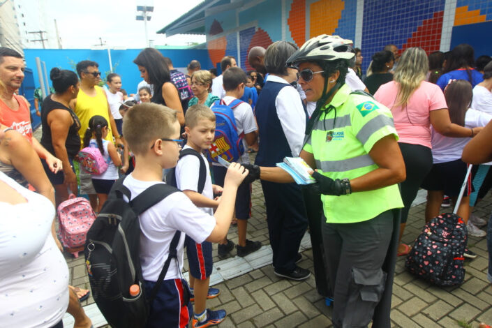 As atividades envolvem orientações presenciais com agentes de mobilidade, distribuição de materiais educativos e ações de conscientização com foco no comportamento seguro nas vias próximas às unidades escolares.
