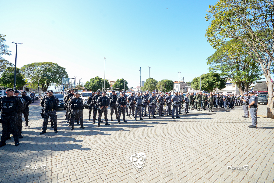 Equipes do BAEP, Força Tática, ROCAM, Polícia Militar Rodoviária, Policiamento Ambiental, entre outras, participaram da mobilização, que também contou com drones, cães policiais e o apoio da Polícia Civil e Guardas Municipais. O objetivo é reforçar a presença policial e combater crimes como homicídios, roubos e tráfico de drogas na cidade.