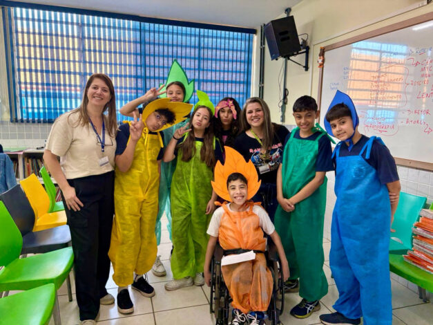 A professora Renata Oliveira, de Artes, trabalhou com os alunos na confecção de figurinos e adereços, já o professor Jorge Roldan, de Inglês, orientou na elaboração de legendas e atividades de roteiro junto às turmas do 8º ano e a professora regente do 4º ano abriu espaço para a participação de um estudante fluente em libras.