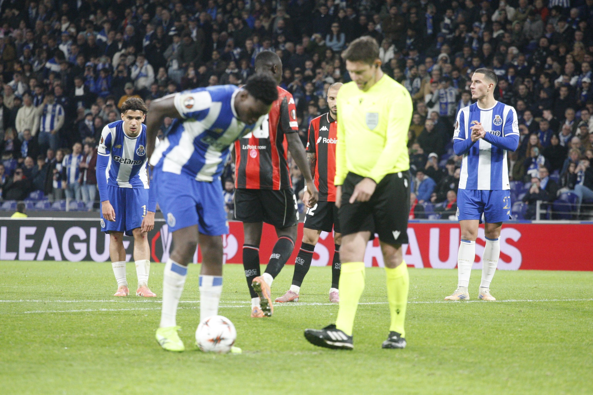 O ataque à baliza do Nice começou bem cedo e na primeira jogada do desafio, logo aos 18 segundos, Gabri Veiga apontou o golo mais rápido da Liga Europa. Numa saída já característica, o FC Porto colocou todos os seus jogadores na linha do meio-campo e avançou em peso para cima do adversário. O brasileiro Pepê combinou com o lateral Alberto Costa no flanco direito e cruzou atrasado, onde apareceu o médio espanhol a arrancar um remate forte, sem dar qualquer hipótese de defesa ao guardião do conjunto francês. Só mesmo um golo tão madrugador do internacional brasileiro Galeno, num jogo da Liga Portugal com o Rio Ave em 2024/25, avivou a memória dos adeptos portistas. Incrédulos, os adeptos do Nice – pouco mais de um milhar nas bancadas -, iniciaram logo aí protestos veementes, que se fizeram sentir de forma pouco usual aquando do segundo golo portista, abandonando os seus lugares. E a debandada geral aconteceu quando o árbitro deu por concluída a primeira parte da partida, situação muito pouco comum e mesmo insólita, virando as costas à sua equipa num momento bastante conturbado do historial do emblema francês.