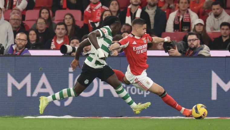O dérbi de Lisboa teve um pouco de tudo, feito de muita luta, especialmente nos duelos individuais entre os sul-americanos de ambas as equipas que por norma fervem em pouca água, rasgos de futebol emotivo, mais do que bem jogado, e algumas jogadas de bom recorte técnico. Não muitas, pois o encontro não foi particularmente um hino ao futebol e contou com muitas faltas, mas a emoção esteve sempre presente, aliás como habitualmente acontece quando os rivais da capital se encontram. O Sporting teve a felicidade de ser o primeiro a marcar – é o termo -, pois aos 12 minutos beneficiou de um autêntico brinde: o guardião ucraniano Anatoliy Trubin colocou a bola, com um passe curto, à disposição do médio Enzo Barrenechea, sendo de imediato pressionado pelo dinamarquês Morten Hjulmand, que entregou a bola de pronto a Pedro Gonçalves, para o avançado leonino atirar facilmente a contar. Um erro tremendo que deixou José Mourinho muito irritado e o caso não era para menos.