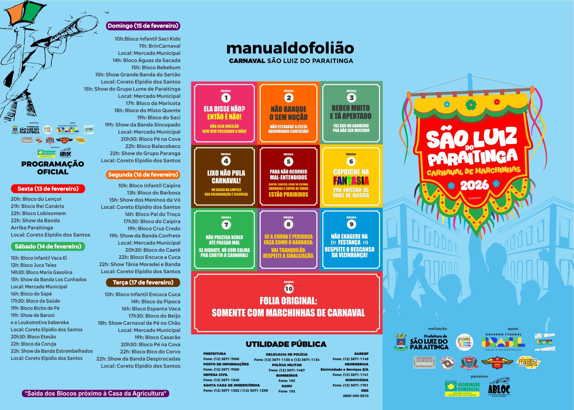 A programação oficial inclui desfile dos blocos, apresentações musicais e atividades infantis, sempre embalados pelo ritmo das marchinhas, característica que diferencia São Luiz do Paraitinga de outros carnavais do país e preserva uma das manifestações mais simbólicas da cultura popular paulista.